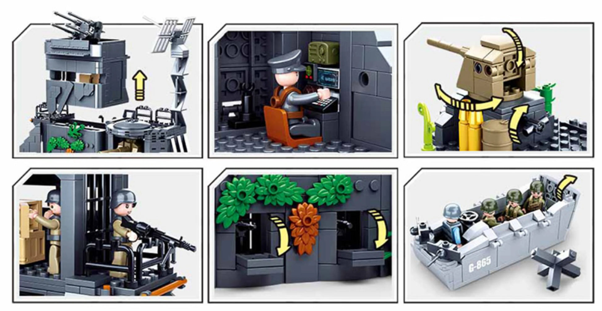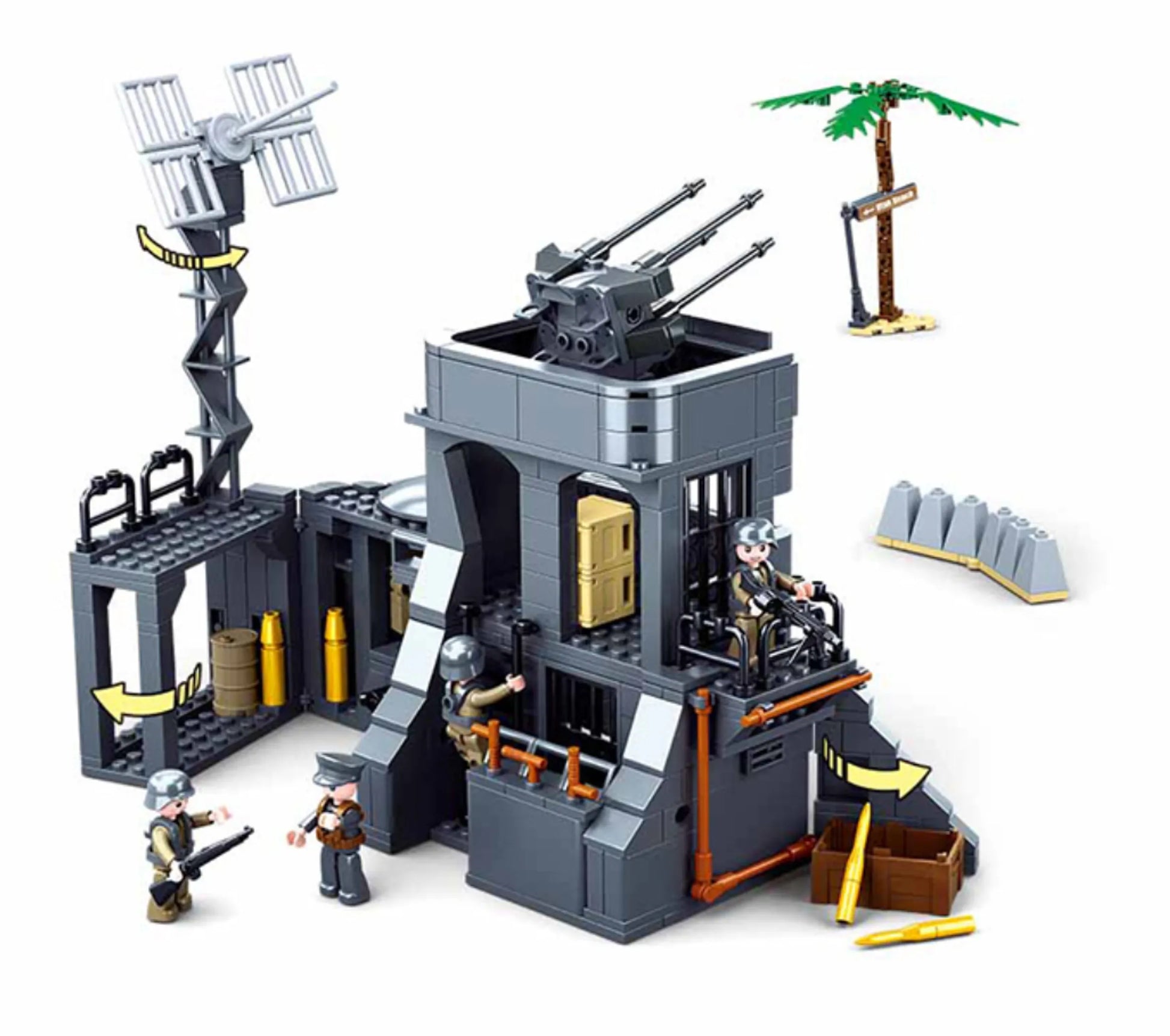 The Sluban WW2 Atlantic Wall D-Day Set has it all! The D-Day set has a Large "Atlantic Wall" Building, With a small Command center, Radar Installation, Coastal Canon, AA Anti-Aircraft Guns, and German Field Gun.